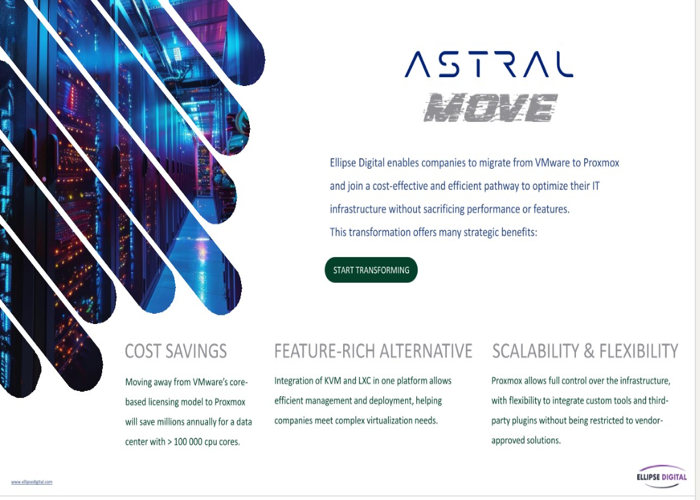 Ellipse Digital enables companies to migrate from VMware to Proxmox and join a cost-effective and efficient pathway to optimize their IT infrastructure without sacrificing performance or features...